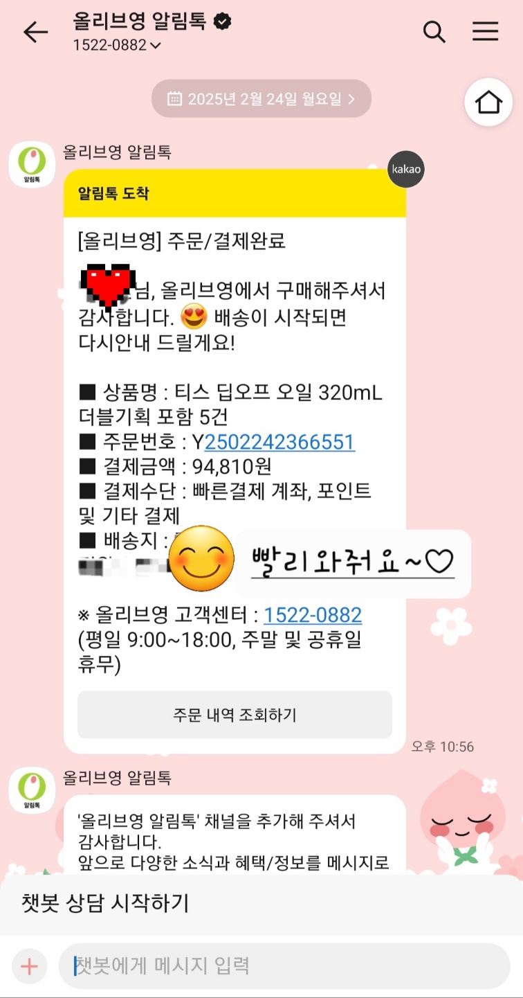 짜라란~! 결제완료되어 카카오톡에 알림톡 온 내용입니다.