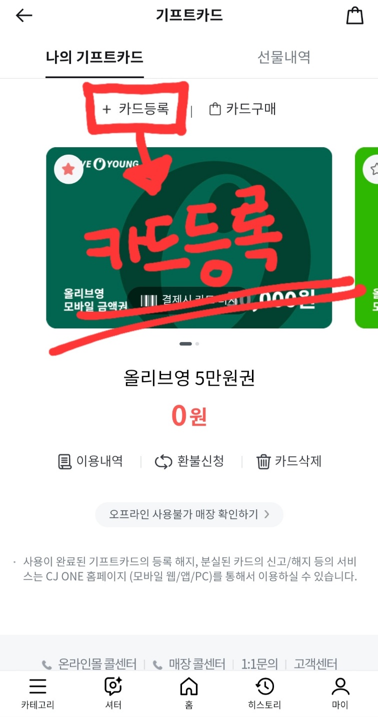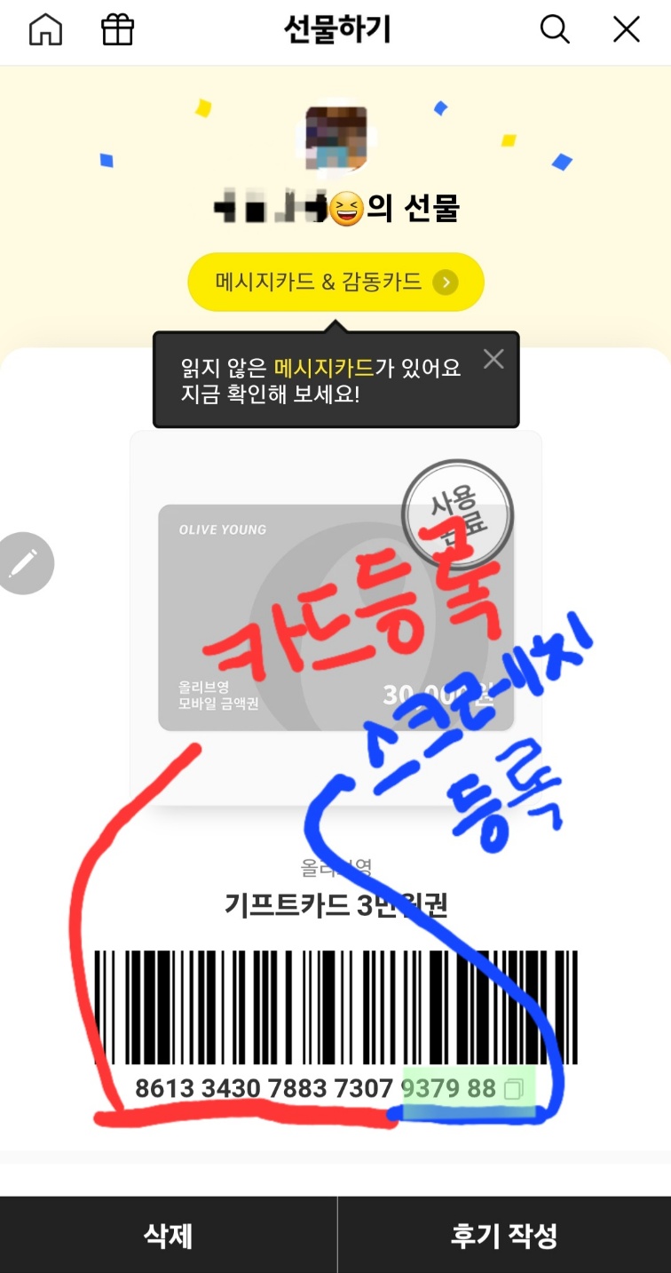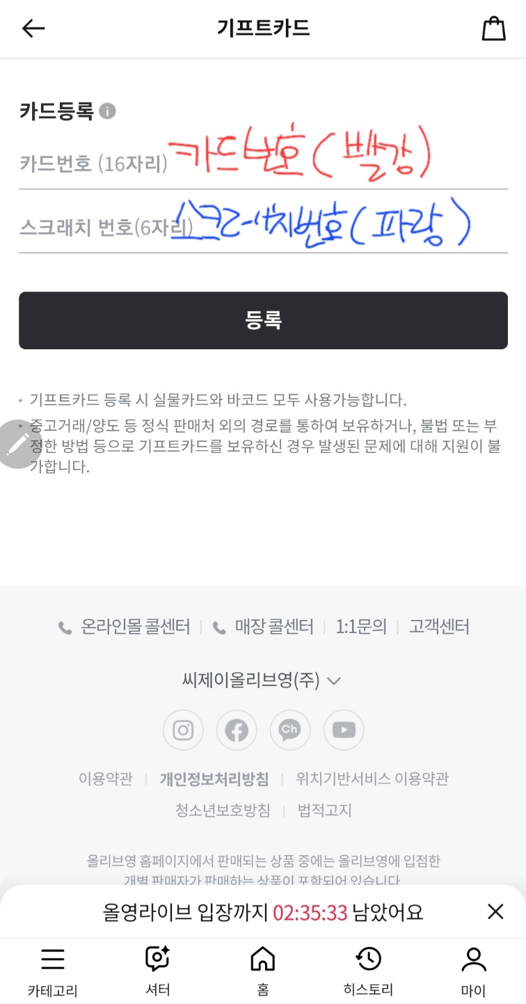 스크래치등록 자리에 마지막 6자리를 등록해야 완전히 기프트 카드 등록이 완성되더라고요.