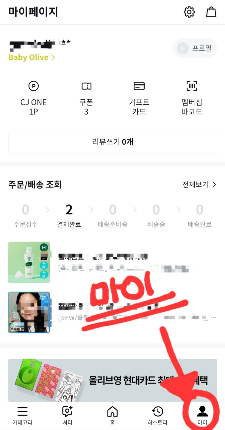 아래와 같이 올리브영 앱을 켜고 마이페이지를 누르면 맨 오른쪽 아래에 마이라는 곳이 있어요.
