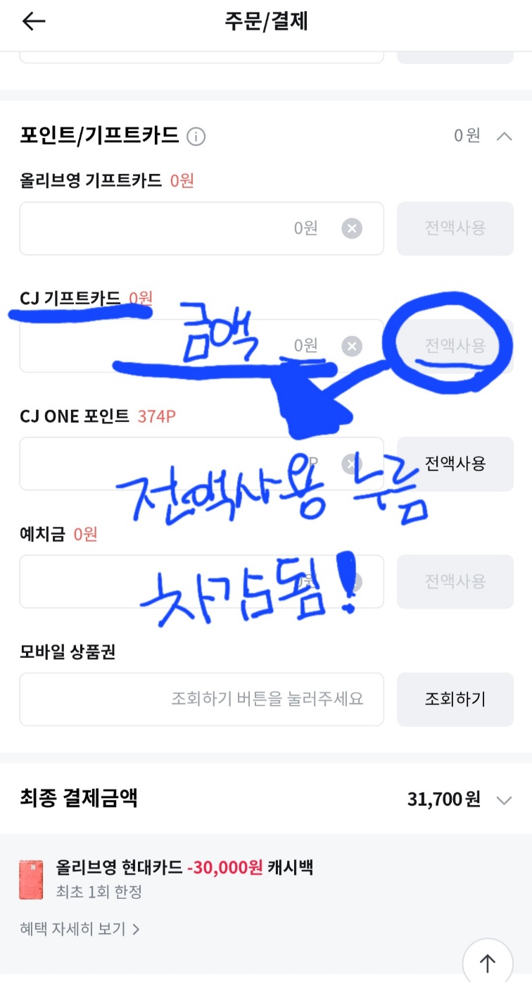 CJ기프트카드 전액사용을 누르게 되면 여기에서 차감되어 결제가 됩니다.